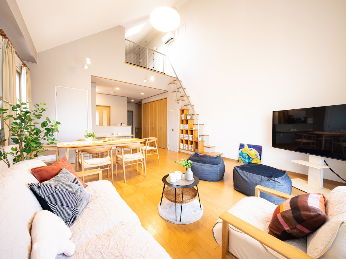 Located in a quiet residential area near the center of Kochi City. The first floor has a long table for relaxation and group work, a telework space, and a spacious built-in kitchen. The second floor has an open Western-style room, a Japanese-style room, and a bathroom, making it perfect for long-term stays. We have paid particular attention to comfort.