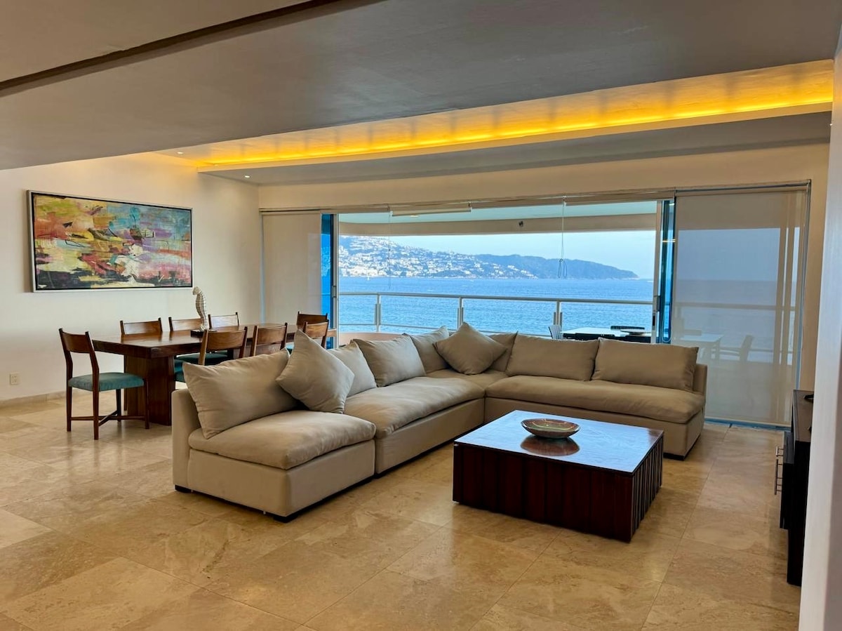 ** MADALAD HINNAD VÄIKESTELE RÜHMADELE. Palun küsi.** See on elegantne ja maitsekas rannaäärne korter Real Diamantes, kus on otsene juurdepääs rannale ja suur privaatne terrass. Luksuslik korter madalhoones, kust pääseb otse valgele liivarannale. Laiaulatuslik terrass panoraamvaatega ookeanile ja basseiniga. Asub Acapulco Diamante piirkonnas - turvaline, ilus, luksuslik - 3 infinity-basseini.