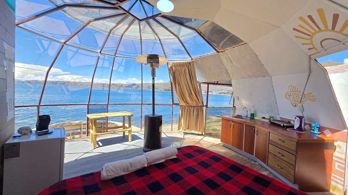 Este lugar memorable es cualquier cosa menos común. Despierta flotando frente al Lago Titicaca Nuestros domos suspendidos ofrecen una experiencia incomparable: un espacio acogedor, moderno y elevado, similar a un teleférico privado, con una vista panorámica de 180° hacia uno de los paisajes más sagrados y hermosos de Bolivia, cada amanecer entra suavemente por los amplios ventanales, mientras el lago y las montañas te regalan un espectáculo natural imposible de olvidar. con jacuzzi y sauna