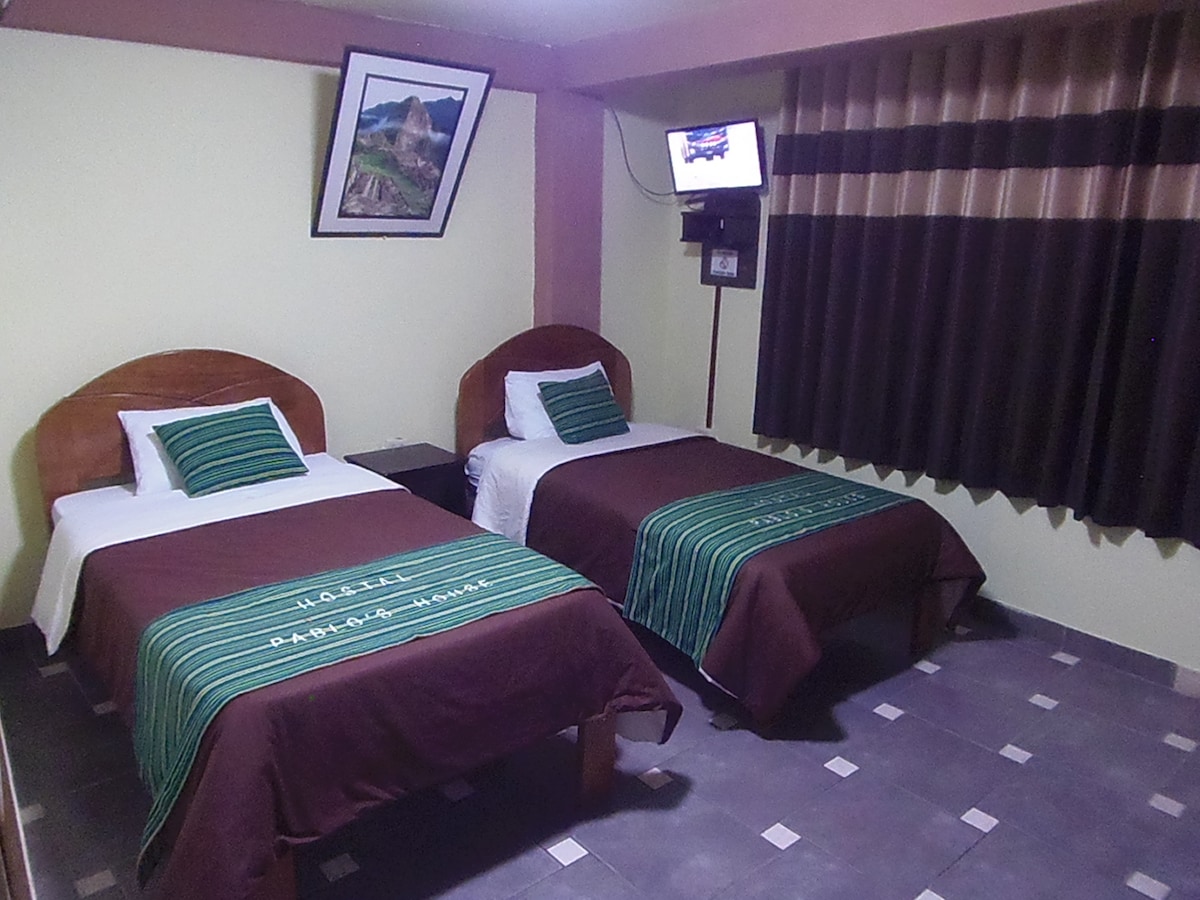 Toas ON ÜKS KAHEINIMESEVOODI (2p) JA TEINE RUUDUKUJULINE VOODI (1p), toas on hügieenimugavused. Isiklikud puhastusvahendid: rätikud, üks paberirull, kaks seepi, kaks šampoonipatja. Sellel on küünlavalgus, seinariidepuu, laud (70 cm x 70 cm) KAHE TOOLIGA, uksematt. SELLEL ON kaks EKSEMPLARI Cusqueño kunstnike tehtud maalidest.