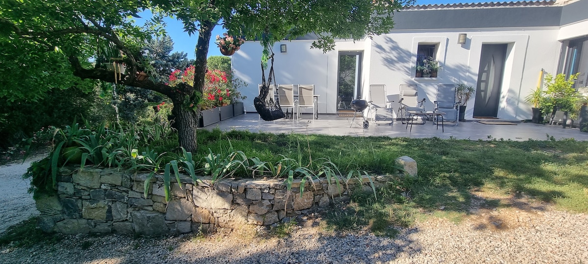 Ideaalses asukohas, Nîmes 'i ja Montpellier' vahel, oled 20 minuti kaugusel Arènes de Nîmes 'ist, 30 minuti kaugusel Montpellier' st ja 35 minuti kaugusel randadest. Oma soovide kõrgusel külastad ümbruskonda (45 min), Pont du Gard 'i, Avignoni, Uzèsi hertsogkonda, Camargue' i, Saintes Maries de la Merit... Sul on kõik mugavused laiskaks puhkuseks! Meie villa tervitab sind kaunil 40 m2 varjutatud terrassil, kust avaneb vaade metsaaiale ja selle basseinile.