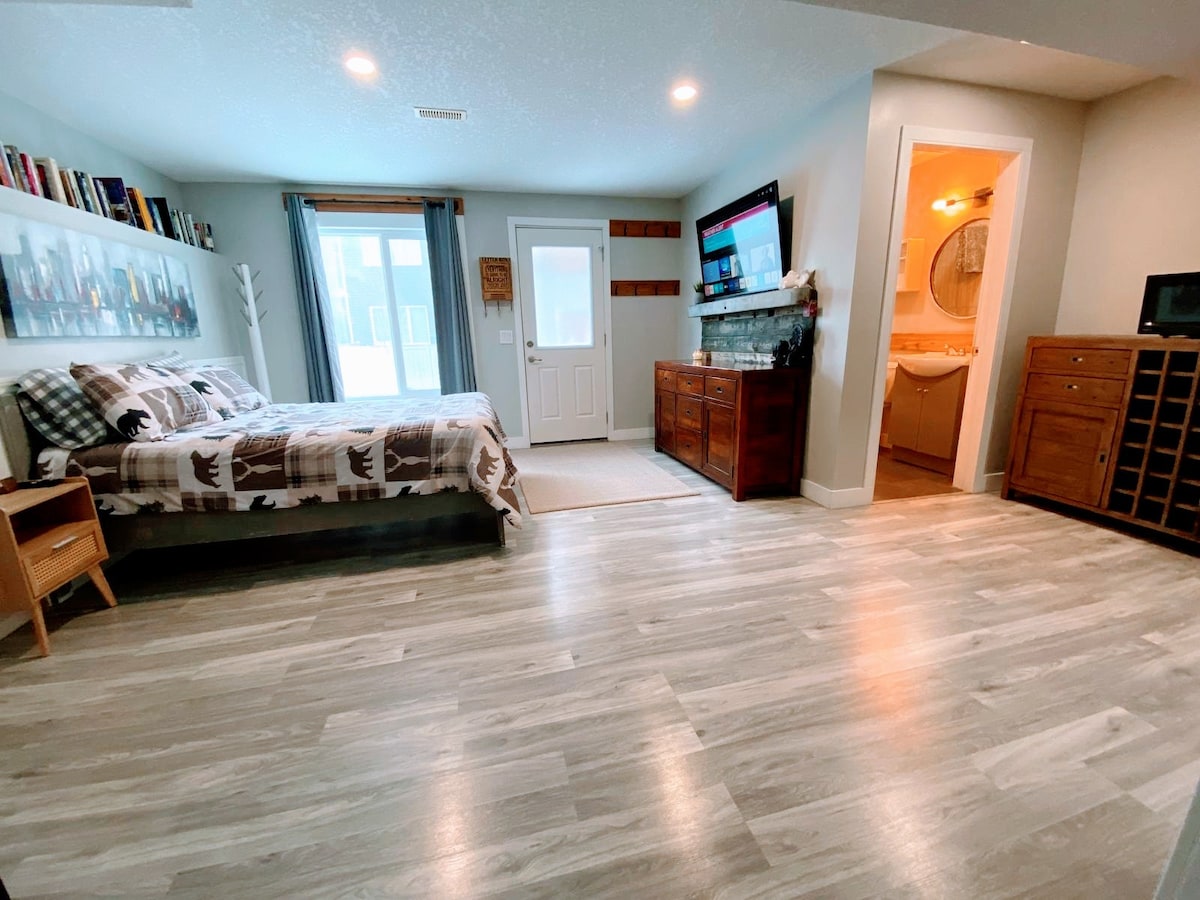 In the SW corner of Airdrie, perfect location to quickly access HWY 2, Stoney, Banff, YYC Int Airport and Cross Iron Mills. Bright cozy private clean suite open-concept featuring a comfortable queen bed and warm décor. Plenty of natural light with a calm, welcoming atmosphere. Library adds a cozy touch for relaxing stays. BBQ and yard perfectly complete the space. Catch a sunset and a mountain view. Nicely stalked kitchenette to make meals and relax at the end of the day. High speed Wifi.