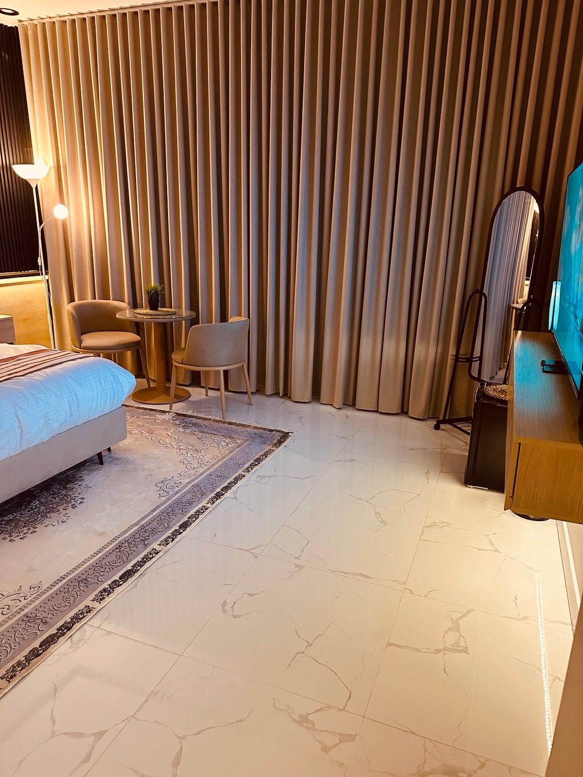 Tere tulemast sellesse elegantsesse ja luksuslikku tuppa, mis ühendab elegantsi ja mugavuse igas nurgas ning pakub ideaalset peatumist üheks ööks või pikemaks peatumiseks. Mugav kaheinimesevoodi koos valgusega voodi all lisab soojust ja ilu suure akna, mis lisab suurepärast loomulikku valgustust, nutikat ja suurt telerit, kombineeritud kliimaseadet Tuba on kujundatud rahulikus ja mugavas stiilis, beežide ja kuldsete värvide ning soojade puidust detailidega. Valgustus on hoolikalt läbi mõeldud, et see sobiks erinevatele aegadele: valgusküllane hommik või vaikne õhtu, mis sobib paaridele, üksikreisijatele või isegi ärikülastajatele.
