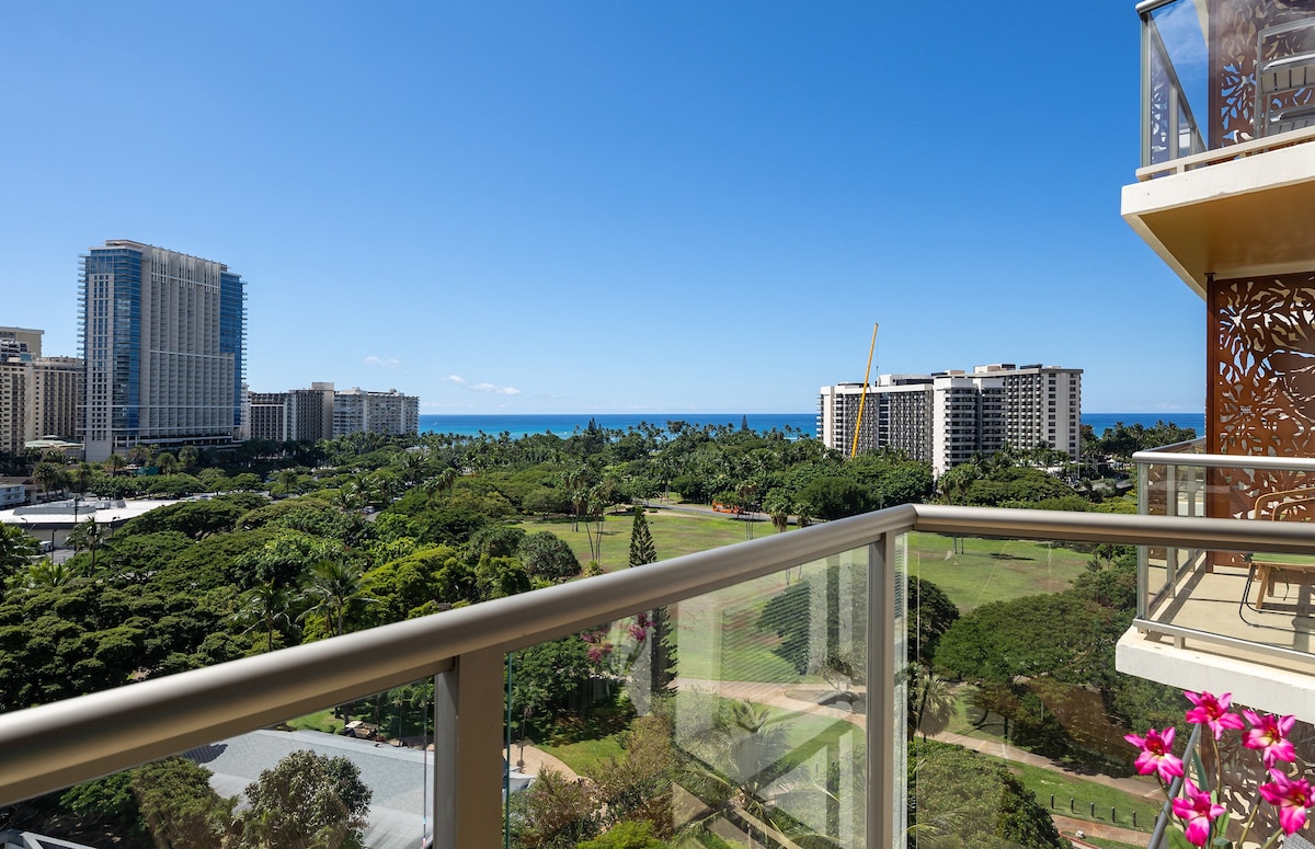 Naudi täiuslikku puhkust paaridele ja väikestele peredele, kes külastavad Waikikit! Tule koju selle kauni 1-vannilise nurgastuudio juurde, KUS on privaatne lanai, millel on Luana Waikiki SUURIM stuudio põrandaplaan ilma kuurorditasudeta! Lihtne ja lihtne lahkumine (majapidamistöid pole vaja teha)! Asub Kalakaua avenüü laudtee ääres, vaid mõne sammu kaugusel Luxury Row 'st (Channel, Gucci ja palju muud!) ja paljudest söögikohtadest. Tee lehtedega jalutuskäik läbi Fort Derussy pargi randa, mis on vaid 2 kvartali kaugusel