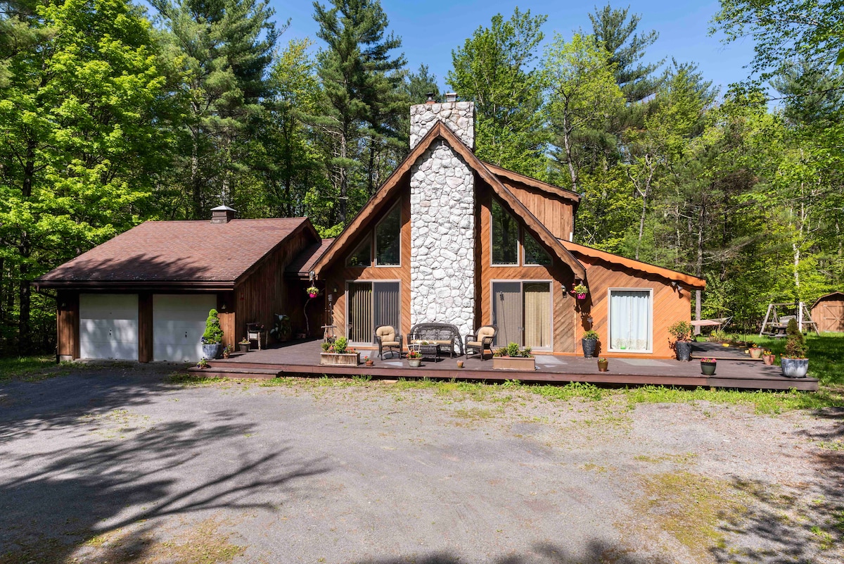 Tere tulemast ilusasse Catskillsi! Meie ilus A-kujuline mägisuvila asub 6 aakri suurusel privaatsel metsamaal, kust avaneb kaunis vaade loodusele. Tule ja peatu värskes õhus! Mägisuvila on täielikult varustatud, et seda nautida igal aastaajal! Lõõgastu kaetud terrassi all igasuguse ilmaga (vihm või lumi) MULLIVANNIS või lõõgastu välisektsioonis, vaadates NETFLIXI/YOUTUBE 'I telerit aastaringselt meie väliteleris, pildista PILJARDIT meie ülakorruse loftis või matka läbi meie privaatse RAJA!