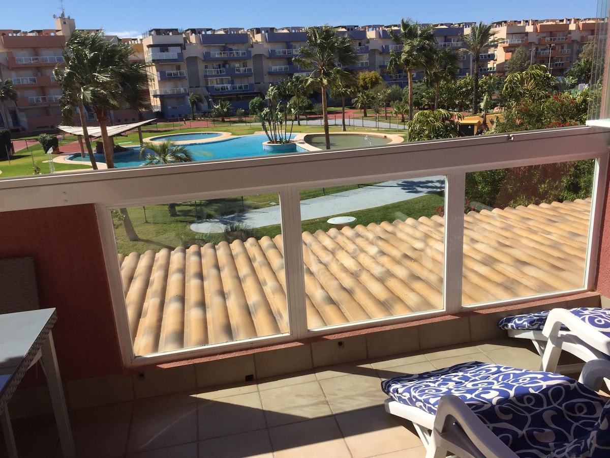 Selle ülemisel korrusel asuva korteri suurepärane vara, mis asub ideaalselt ranna lähedal, on jahisadam, restoranid ja poed (Mercadona), mis on golfiväljaku ees, on selle solaarium, mis on varustatud 2 lamamistooliga ja pergolaga, kus on aiamööbel. Sangriat juues naudi rabavaid vaateid rohelustele ja Sierra Nevadale Hiljuti renoveeritud korter asub ilusas elukohas, mille suur bassein on avatud märtsist oktoobrini.