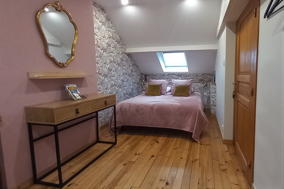 Pakun 1 suurt mugavat külalistetuba, mis on hiljuti maitsekalt renoveeritud iseloomuga majas. Seal on privaatne vannituba. Juurdepääs ühiskasutatavale ruumile, kus on väike toitlustus, puhkus, lugemine, mängud. Soe ja sõbralik tervitus, hommikusöök koos kohalike toodetega ja võimaluse korral hooajaliselt. Teavitan oma külalisi paljudest lähedal asuvatest turismivõimalustest: suusakuurordid, termovannid, matkamine, jalgrattasõit, loomapargid, kohalikud turud.