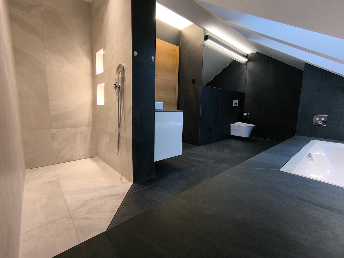 Ilus, kaasaegne ja valgusküllane korter väga vaikses asukohas 3 magamistoaga kortermaja pööningul 1 SZ kaheinimesevoodiga 1 narivoodiga magamistuba 1 magamistuba üheinimesevoodi, kappvoodi ja diivanvoodiga Vannituba duši ja tualetiga Avar elutuba Hubane diivan ja teler Söögilaud 6 inimesele Avatud, täielikult varustatud köök Hiiglaslik päikeseterrass fantastiliste vaadetega Jalutuskäigu kaugusel: supermarket, mitu pagarit, apteek, hoiupank ja pank, võõrastemajad, restoranid