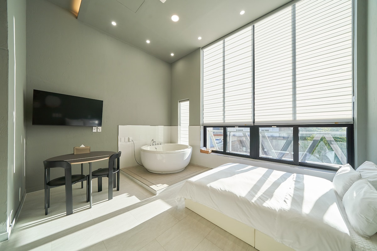 안녕하세요. 강릉 사근진/순긋해변 바로 옆 스파 객실입니다. 해변까지 도보 1분거리의 가까운 숙소로 바다 체험과 함께 스파를 통해 휴식을 취하실 수 있습니다. 차분하면서도 스타일이 살아 있는 숙소에 오셔서 스파와 함께 편안한 휴식을 즐기세요.항상 최선을 다해 고객님을 모시겠습니다. 감사합니다.