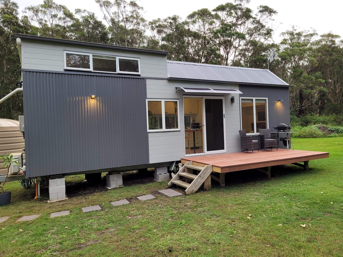 Escape to this luxury self contained and peaceful, 10 metre Tiny Home surrounded by bushland yet only 3km's from beautiful beaches, restaurants, supermarkets and all services you would need Step out on your deck, absorb the sea breeze & sounds of nature as you're greeted by friendly sheep All the comforts of home. Mobile reception, wifi, Full kitchen, reverse cycle AC, cozy loungeroom loft even a bath to soak in STRICTLY NO pets or children. But 2nd cabin nearby does, link below