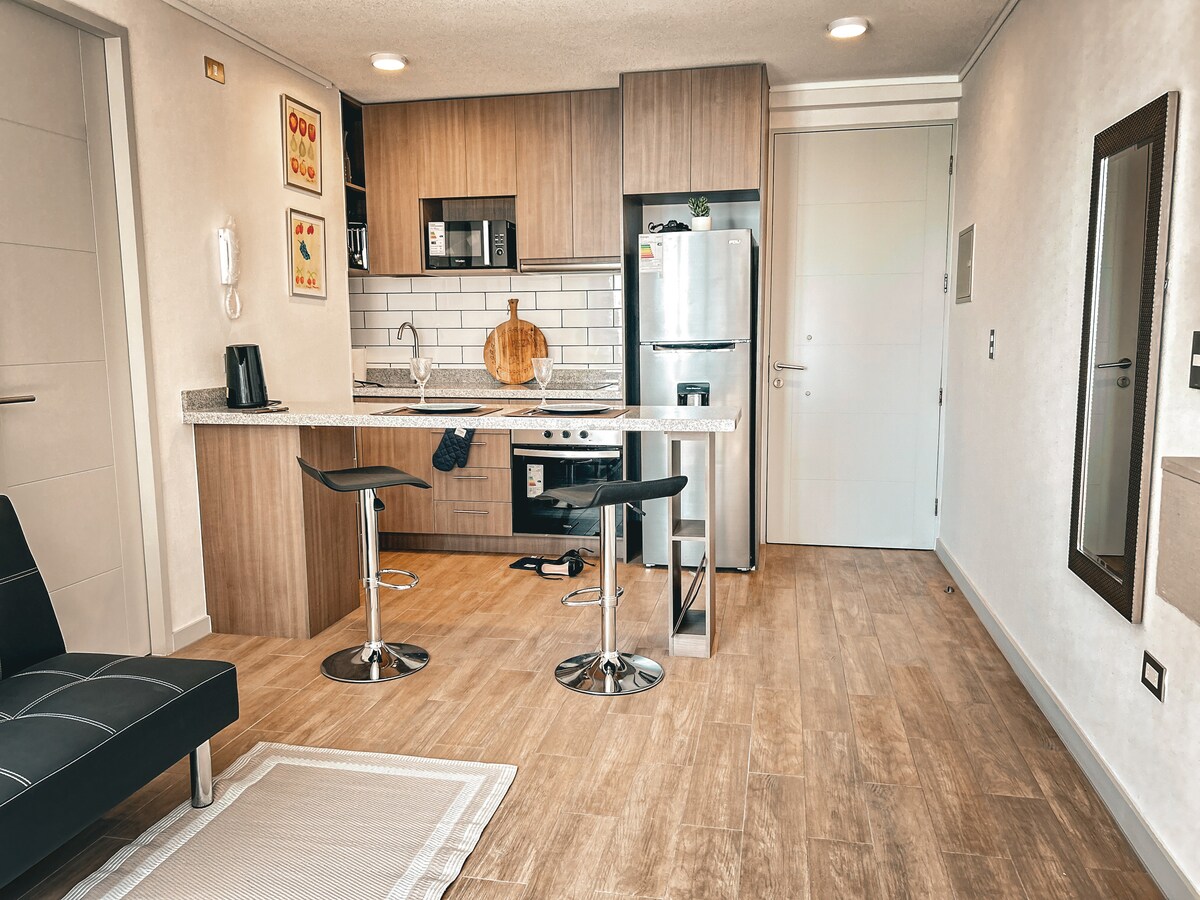 Departamento de 1D y 1B, amoblado y equipado en Antofagasta. Ubicado en condominio a 2 calles de terminal de buses y en avenida costanera con excelente conexión al aeropuerto y centro comercial. Tiene accesos controlados y amenities en espacios comunes , tales como gimnasio gratuito previa solicitud, aunque sujeto a disponibilidad. Estacionamiento disponible. Cuenta con Smart TV y wifi libre. Cuenta con señal de televisión abierta.