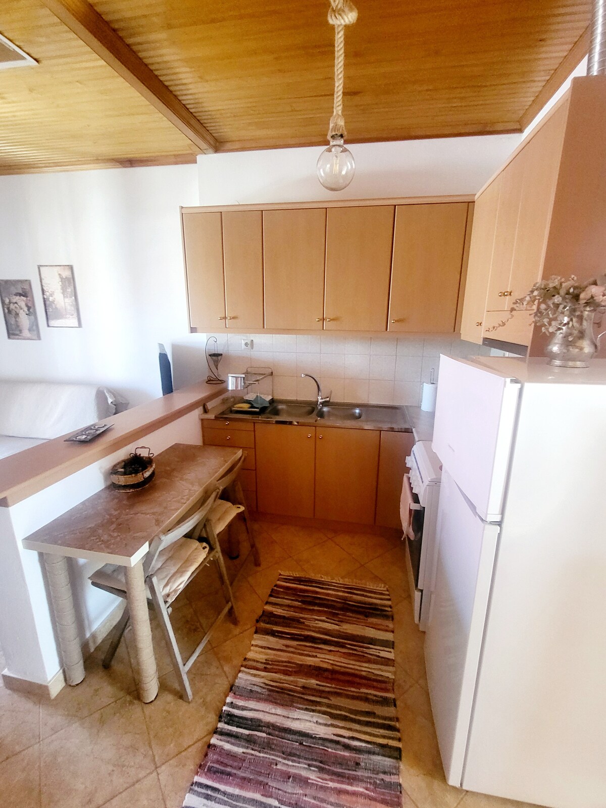 The apartment is on the first floor in a traditional building located in the village's square. It has a fully equipped kitchen, bathroom and a bedroom with double bed. There is also a sofa bed (for one person) beside the bed. The apartment is one room apartment. There is also a balcony with view to the mountains and the square. Is air-conditioned and in the ground floor in the same building there is a small market with many goods and coffee shop which is also availability for breakfast .