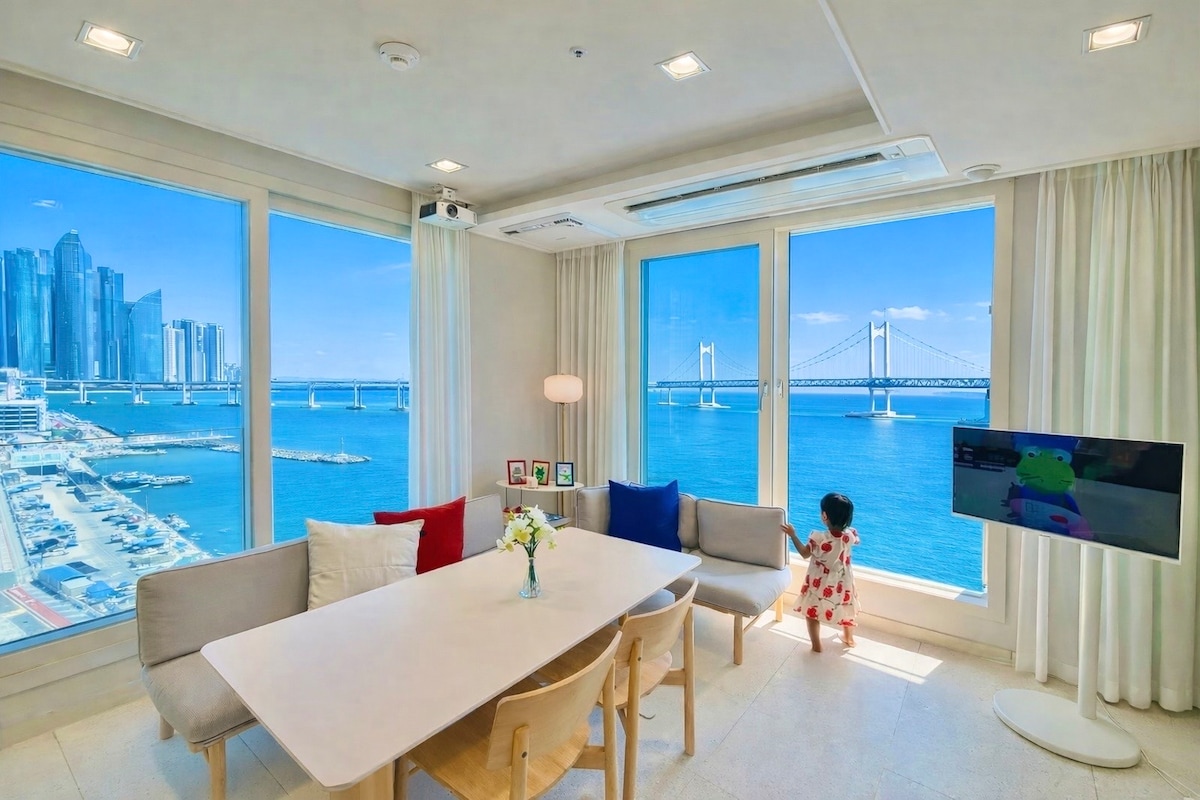 Esmaklassiline majutus/Gwangani sild vaatega ookeanile + Haeundae linnavaade/3 tuba (2 avarat magamistuba + elutuba)/3 kaheinimesevoodit/tasuta parkimine/5-tärniline hotellitase