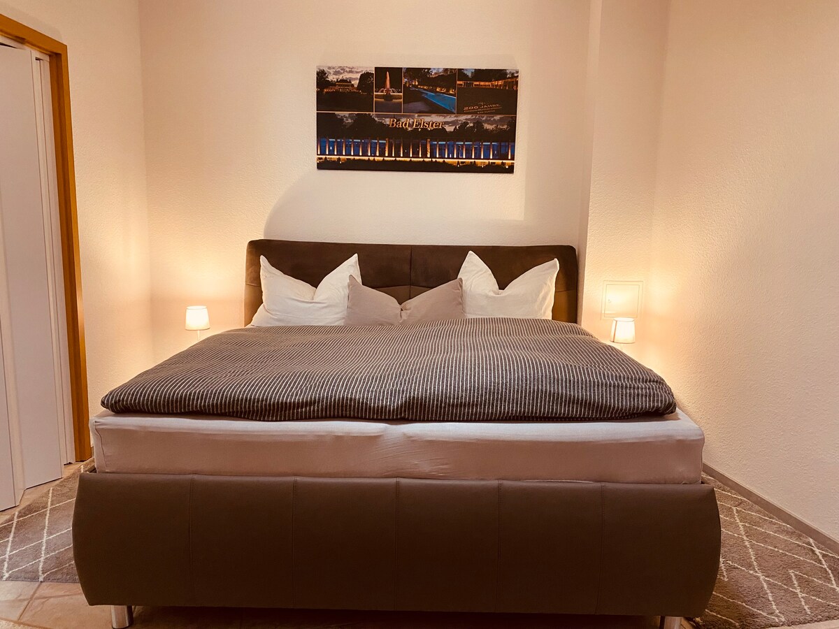 Stiilne korter, kus on ruumi ja hubasus vaikses asukohas. Naudi oma peatumist ajaloolise turu vahetus läheduses ja huvitavate ekskursioonivõimalustega Vogtlandis. Olenemata ilmastikutingimustest, kas hubane kamina ääres või lõõgastu terrassil ja aias. Eraldi juurdepääs toimub kolme sammu kaudu. Korter on ligipääsetav ja põrandaküttega. Saadaval on pesumasin ja kuivati. Magamistuba 1 kaheinimesevoodiga / magamistuba 2 väljatõmmatava voodiga.