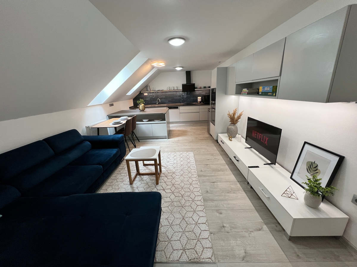 Soovime teid tervitada meie korteris Bánovce nad Bebravou linnas. Korter on ehitatud avatud kontseptsiooniga – see on väga avar, valgusküllane, kõrgete lagedega ja kaasaegse sisustusega. See sobib väga hästi lastega peredele ja külastajatele, kes otsivad ainulaadseid ruume – nagu meie!