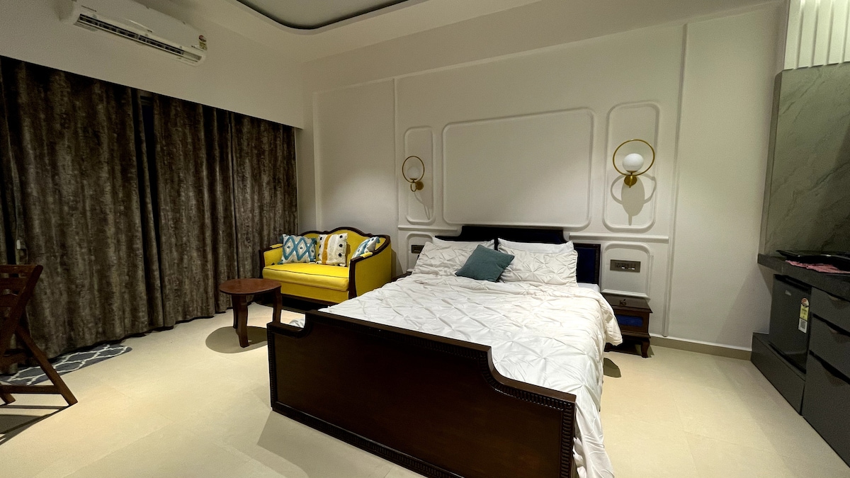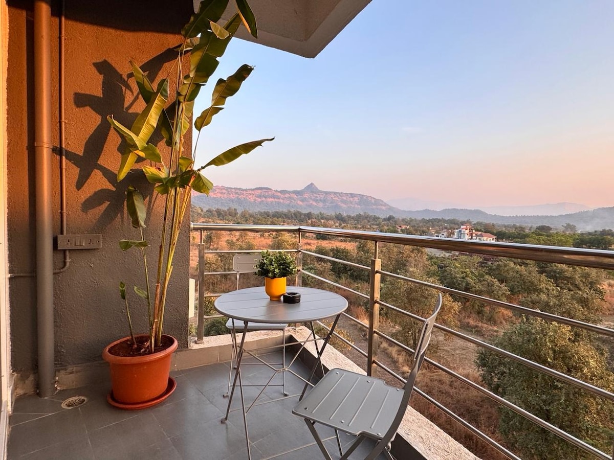Luxurious Yellow Block Studio at the foothills of Ulhas Valley with a pvt. balcony and panoramic mountain views from the top floor. A peaceful getaway to unwind. Fully loaded with WiFi, JBL 2.1 Home Theatre, BT Music System, Full-HD LED TV. A stylish bathroom with toiletries. Pantry with tea/coffee supplies, RO water, Microwave, Induction Hob, Fridge & s/w Toaster and a comfortable study space. Common amenities on-site like swimming pool, games room, gym, mini theatre, cycling and restaurant.