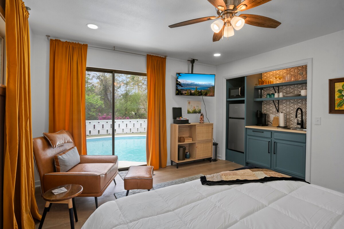Tere tulemast meie 1930. aasta kunstipärasesse sviiti, mis on ainulaadne puhkusereis, luksus, mugavus ja kunst. Naudi algset käppadega vanni, kohandatud Stern & Fosteri madratsit ja privaatset verandat, kust avaneb rahulik vaade aiale. Selles ainulaadsetest kunstiteostest ümbritsetud koerasõbralikus sviidis on täielikult tarastatud aed sinu karvastele sõpradele. Eraldi sissepääs, pesuruum ning keskendumine mugavusele ja lõõgastumisele, nagu näha HGTV kodulinna 6. hooajal 2. Meie majutuskoht pakub tõeliselt unustamatut peatumist.