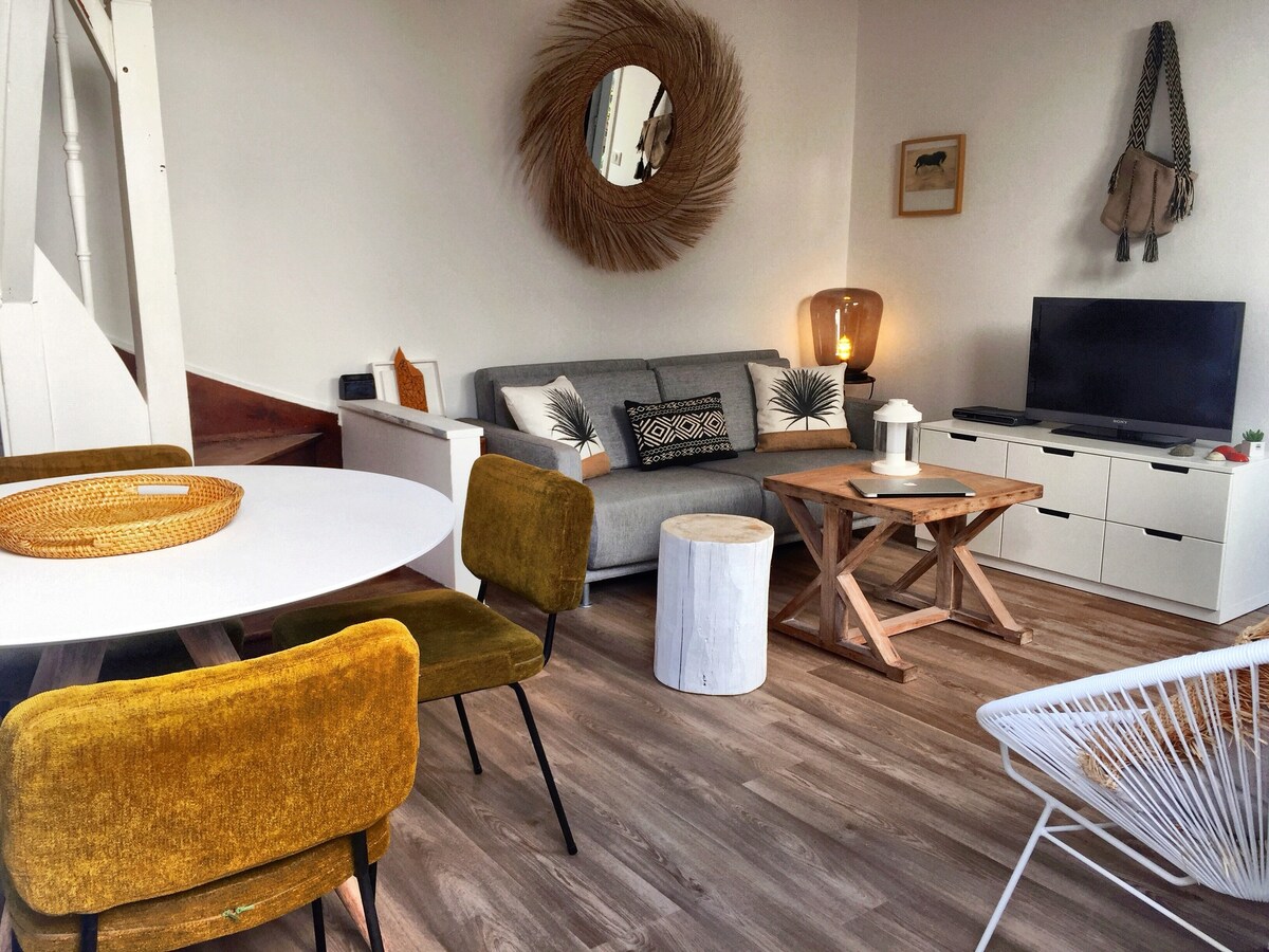 Kutsume sind peatuma meie peremaja esimesel korrusel, mis pärineb 30ndatest aastatest . see on 15-minutilise jalutuskäigu kaugusel rannast ja kesklinnast. Vaikne piirkond. 60 m2 valgusküllane ja renoveeritud majutus hõlmab magamistuba, elutuba, kööki, söögituba, vannituba (vann) ja terrass . Lihtne ja soe mugavus. Meie poeg Robin, kes õpib Biarritzis ja elab esimesel korrusel , kohtub teiega siinviibimise ajal.