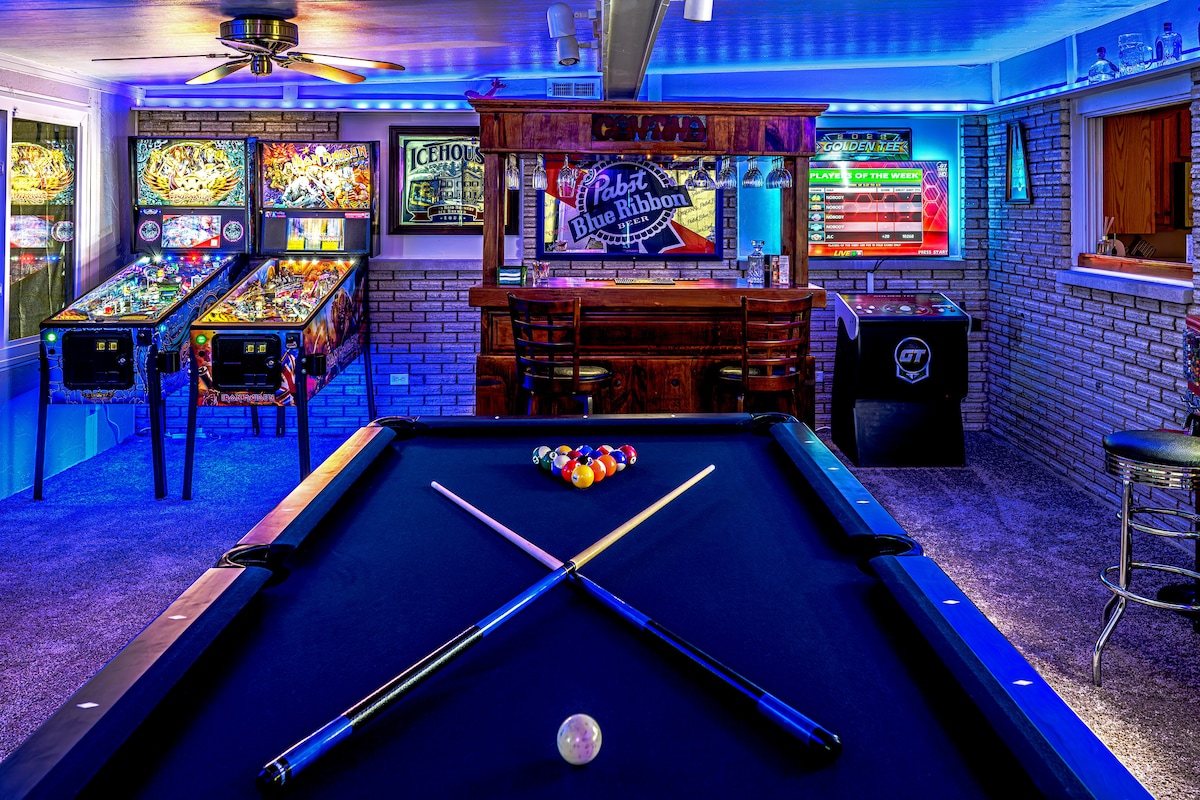Relax in Style at Our Spacious Entertainment Retreat The space comfortably sleeps up to 8 guests, with two king-size beds a Queen Bed and a pull out sleeper sofa with memory foam mattress. Unwind after a long day in our luxurious Hot Tub or rejuvenate in the sauna and massage chair. Enjoy endless fun in the fully equipped game room with brand-new pinball machines, a pool table, slot machines, Golden Tee, and a Multicade arcade system with over 5,000 games — all free to play!