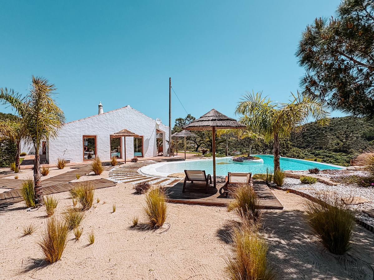 Maja on traditsiooniline Alentejo maapiirkonna maja, mis on restaureeritud hoolikalt ja austusega selle algsete ruumide materjalide ja atmosfääri suhtes. Kogu maja on valgeks pestud. Põrand on sillutatud käsitsi valmistatud saviplokidega. Suured tagumikud, laiad korstnad ja jalakivid ankurdavad maja maapinnale ja traditsioonidele. Ruumid on mõõtmete, valguse ja õhkkonna poolest helded. Kahe hektari suurune maa pakub päikesepaistelisi ruume, mida varjutavad korgipuud, vaade maale ja ookeanile ning veepaak.