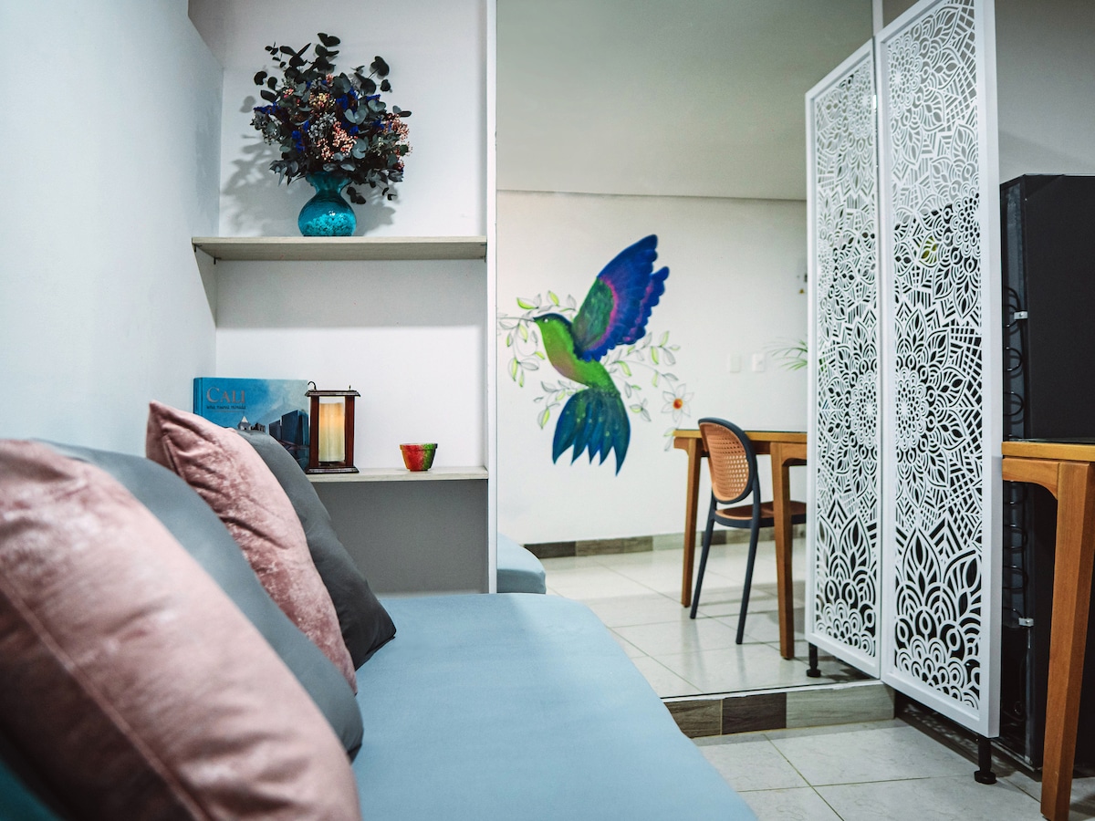 Peatu kaasaegses, mugavas ja uhiuus võrkkiigega korteris, mis on kujundatud Caleño kontseptsiooniga seinamaalinguga, mis äratab meie piirkonna linde. Asub Cali kesklinnas /lõuna pool, 5 min (autoga) kesklinnast, 5 min jalutuskäigu kaugusel 3 gastronoomilisest piirkonnast. 8 minuti kaugusel Estadiost ja Unidadi departemangust ning 5 minuti kaugusel traditsioonilisest San Antonio kvartalist. Sellel ainulaadsel majutuskohal on oma stiil ja nõuanne lennukites turisticos. parqueo eelnev broneering ja lisatasu