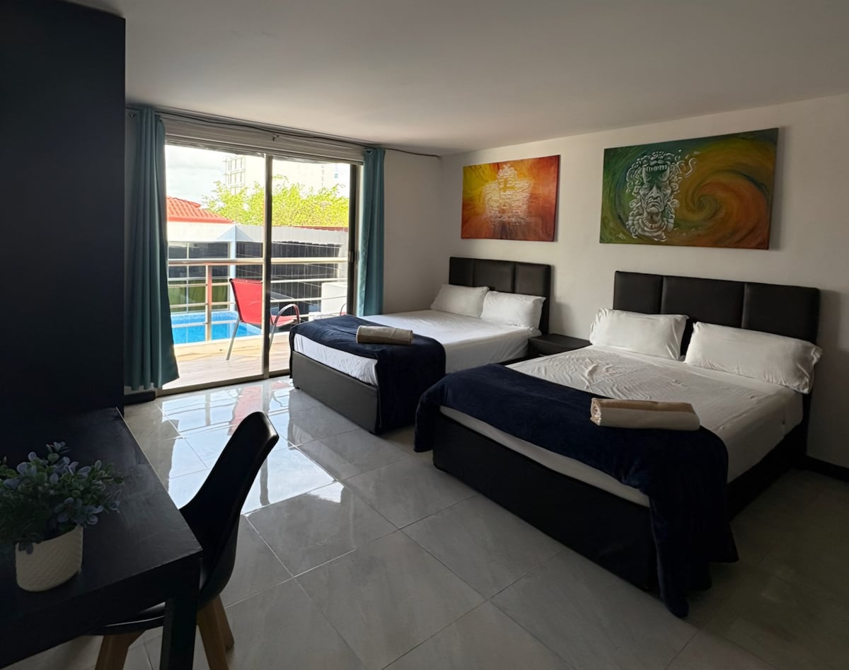 Võluv peresviit korterhotellis koos basseiniga! Ideaalne peredele või rühmadele, kes reisivad koos, kuid otsivad eraldi tube. Neil on 2 eraldi magamistuba ja 1 privaatne vannituba. - Igas toas on: -A/C -SMART kaabeltelevisioon - Riidekapp ja tualett Saad nautida ka selle kauni korterhotelli basseini ja selle kööki. - Asub privaatses elamus koos turvalisusega - suurepärane asukoht supermarketi, bussipeatuse ja restoranide lähedal