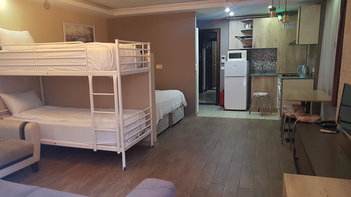 Sinu tuba asub ka Beyoglu südames Taksimis, jalutuskäigu kaugusel Galataportist ja Karaköyst, ühes maailma kõige turistlikumas naabruskonnas. See asub piirkonnas, kus ööpäevaringne transport on lihtne, jalutuskäigu kaugusel on kõik isiklikud vajadused ja pääsed ligi kõigile sotsiaalsetele aladele vastavalt sinu huvides olevatele eelistustele. Võin aidata oma külalisi ööpäevaringse vastuvõtulaua teenusega, et hoida sinu mugavus tipus, kus nad saavad peatuda nagu oma kodu.