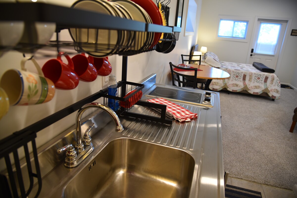 Newly finished garage studio w/ private entrance. Studio has a full size bathroom, studio kitchen with sink, refrigerator, microwave and a 2 burner stove. For your sleeping comfort I have a new queen bed with memory foam mattress. Also, a Mitsubishi heat/AC unit to maintain a comfortable temperature. For an addition fee I offer a workout area complete with dry sauna that heats up to 180. I am a licensed massage therapist, when available I can offer massage by appointment in separate studio.