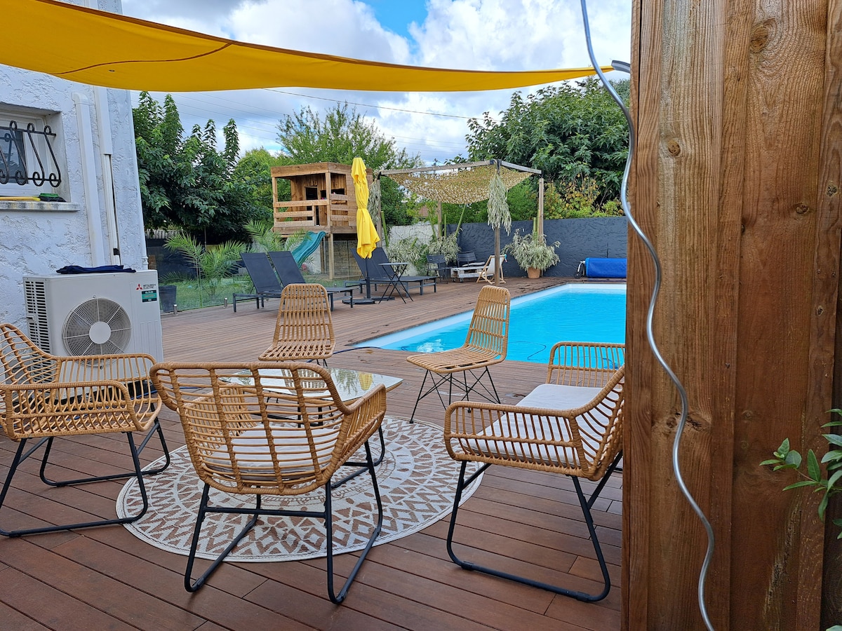 (Basseinivee temperatuur on sobiv alates juunist) Kinnitatud majutaja, pakun sulle seda avarat kivimaja, mis ühendab sarmi ja mugavuse, et pakkuda autentset ja ebatavalist kogemust. Hea asukohaga, 10 minutit trammi teel Bordeaux’ rongijaamast, hõlpsasti ligipääsetav. Täielikult varustatud sinu mugavuse tagamiseks: kvaliteetsed voodipesud, täisköök, mängutuba, suur bassein, Wi-Fi, terrass, aiamööbel, ebatüüpiline sisekujundus, tiheda taimestikuga ümbritsetud varjuline veranda. Tõsine ja paindlik ettevõte.