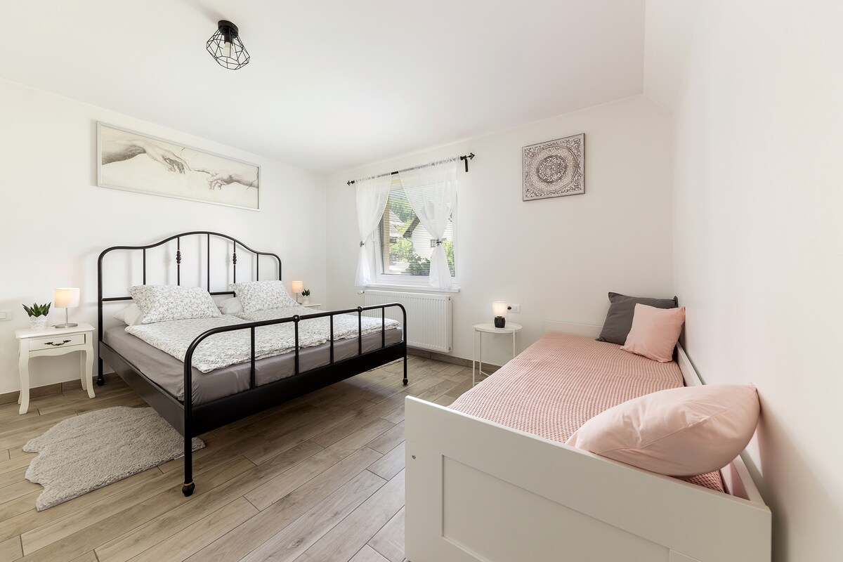 RNO ID: 108456. Apartment is located on the outskirts of Bled, about a kilometer away from the lake (17 minutes on foot-1,2km). The apartment has its own private entrance and bathroom, kitchen, two bedrooms, balcony, television and free wifi. The Supermarket Mercator is only 650 meters away.