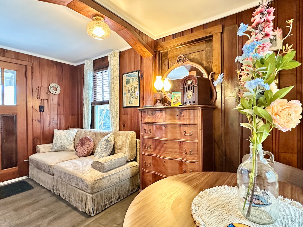 Take it easy at this unique and tranquil getaway. Originally built as a carriage house in 1820 along with the adjoining stone home and a second stone building originally used as an out kitchen. This rustic cottage has been tastefully modernized and has a queen sized bed, full size refrigerator/freezer, gas range, large screen TV, heat pump that supplies air conditioning and heat, hot water shower and outside grille and fire pit.