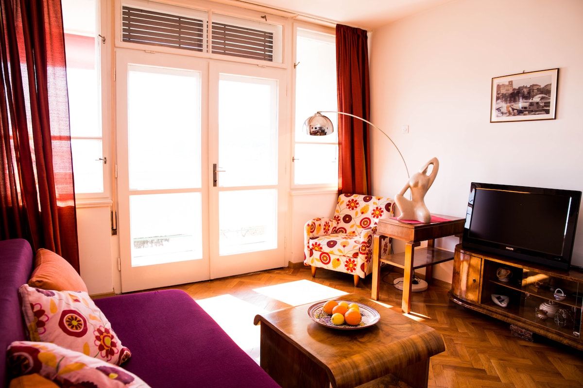 This apartment was freshly renovated in 2025. Spacious and cozy apartment with a lovely sea view balcony. It is placed on the third floor of our family house, “Veli Bok”. The apartment consists of an entrance hall, bathroom, studio area (kitchen, dining area, sleeping area, and living room area), and a balcony. Ideal for a couple or small family with one or two small kids. Our house is located 20/25 minutes' walk from the harbour/main square, which is 1,5 km/2 km away.