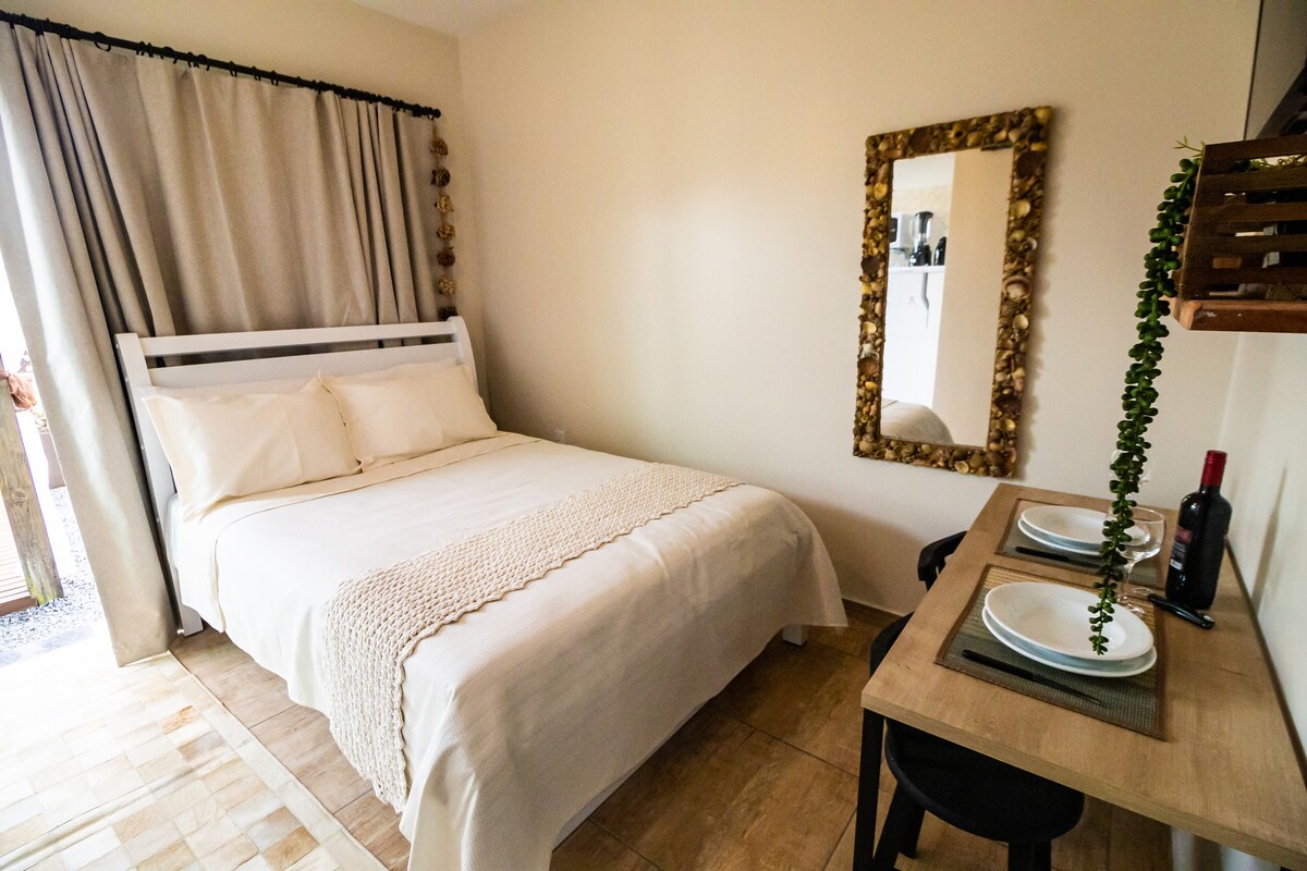 🌿 Refúgio ideal para casal em Bombinhas Apto para casal a 500m da praia e do centro de Bombinhas. Quarto aconchegante com ar-condicionado, sala, cozinha equipada, Wi-Fi fibra e vaga individual. Churrasqueira de uso comum. Lençóis, toalhas, kit praia e utensílios básicos incluídos. Perfeito para relaxar e aproveitar dias tranquilos a dois com conforto e privacidade.