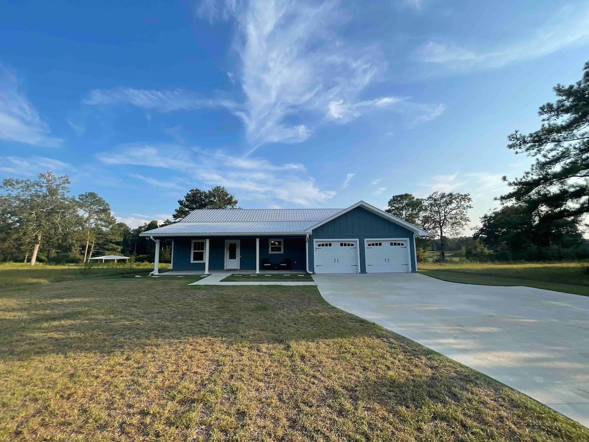 The Lodge is a beautiful open concept farmhouse on 16 beautiful quiet acres with pond and pastures. Fenced front yard for small children and pets. Primary King bed suite Secondary Queen bed suite Wrap around porch with gates. High speed WiFi throughout Gourmet kitchen with 11 foot island, duel range, all with beautiful views of the pond and sunsets from the kitchen. Firepit with beautiful sunsets. Easy access to Troy and Troy University while still being out in the country.l