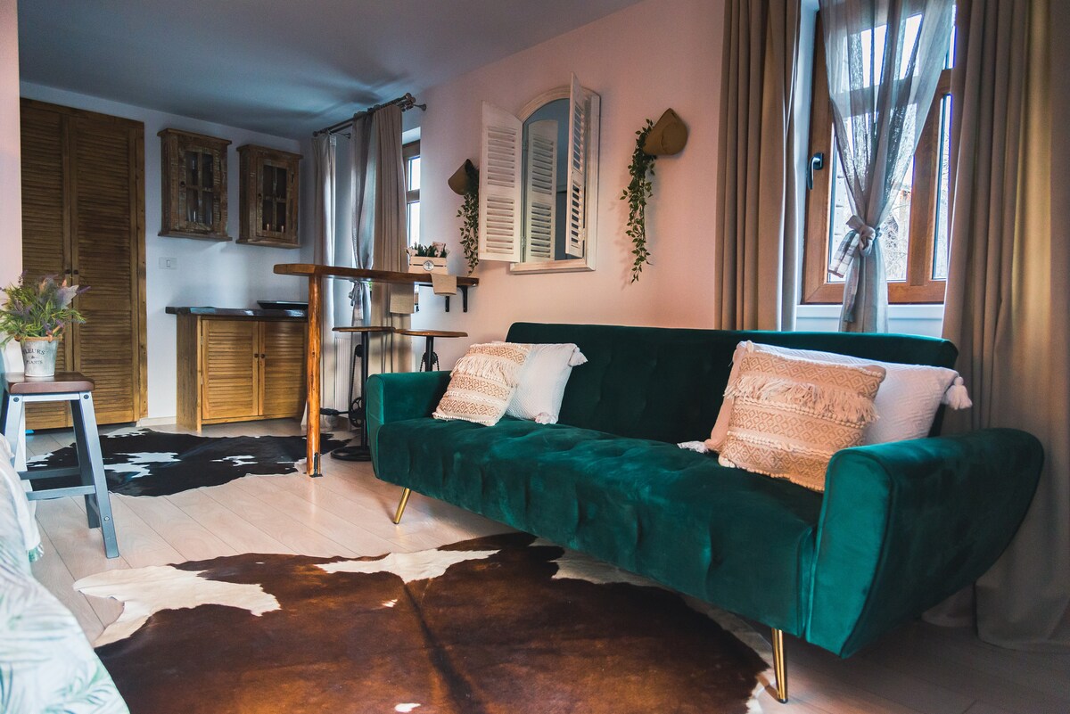 Relax in this cozy ground-floor studio in Vila 1 of Hanul Anei, perfect for couples or small families. The studio features a double bed, a sofa bed, a private bathroom with bathtub, a fully equipped kitchenette, and a private terrace to enjoy fresh air and the courtyard. The studio’s rustic hunting-inspired design gives it a unique, cozy atmosphere. Optional outdoor Jacuzzi (€40/day, must reserve 48h in advance) is available for your group.