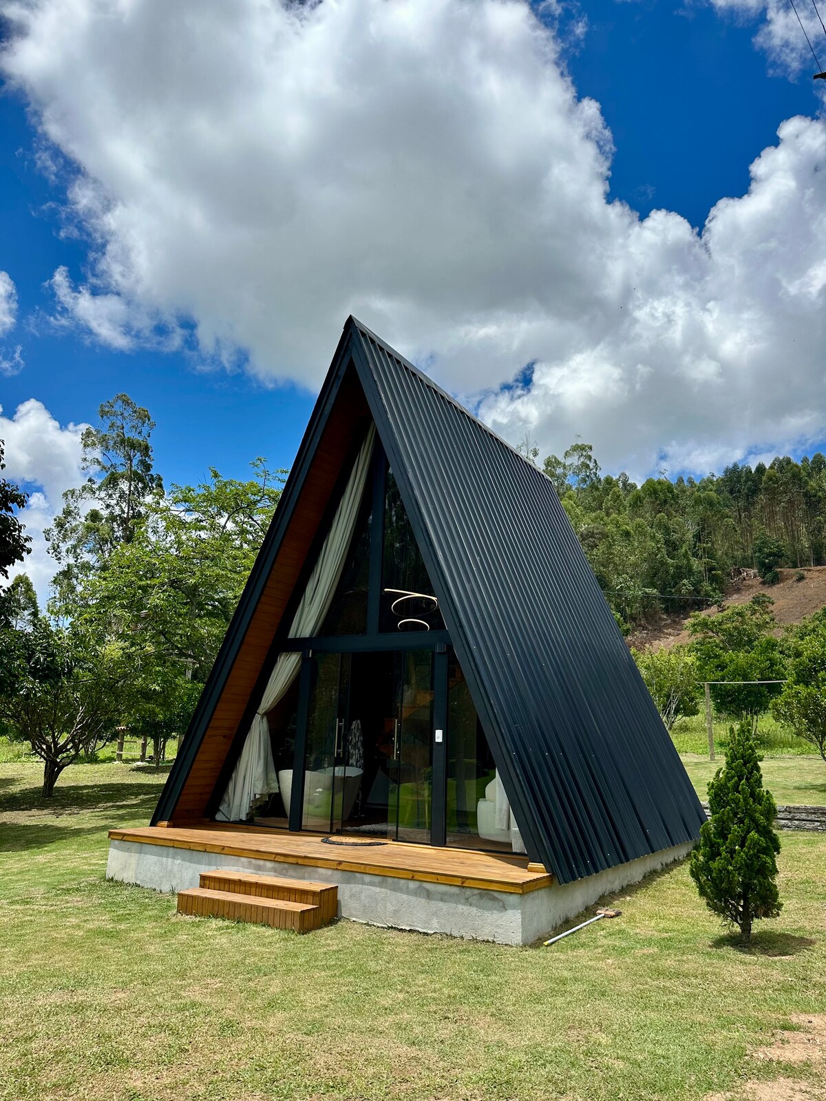 Cabana minimalista com vista total para a Pedra Azul, na melhor localização da Rota do Lagarto. Amplas aberturas piso-teto em todos os ambientes, com total integração com a natureza. Possui quarto com cama kingsize, rede horizontal de frente para a Pedra e ambiente sala-cozinha com sofá-cama. Ambientes climatizados (ar quente e frio) e cozinha completa. A área externa possui uma tradicional Picnic Table, ofurô à lenha, uma mini parilla e local para fogueira.