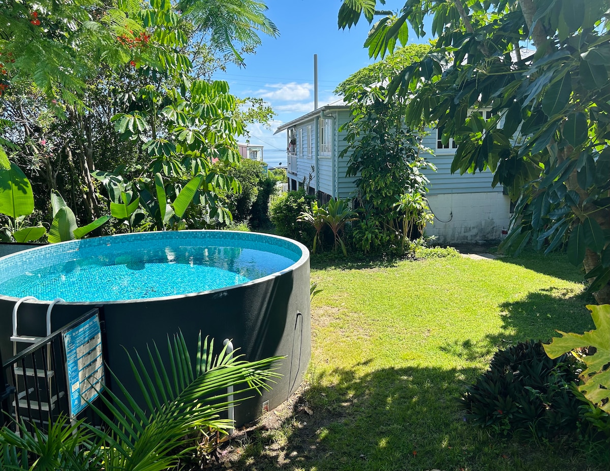 SUUR ILUS PEREDELE. HALDATUD ISIKLIKULT. VÄGA HÄSTI VARUSTATUD, PUHAS pärandmaja. TÄIELIKULT konditsioneeritud, KAKS vannituba. KATTEGA PARKIMINE, SUUR KAETUD terrass vaatega PRIVAATSELE TROOPILISELE AIALE, gurmeeköök, SUUR teler Disney/Netflix, 4 avarat magamistuba (QB, DB, 2 SGL). Jaluta Southbank Beachile, külasta ikoonilisi Brisbane 'i vaatamisväärsusi. Peatu puhtas ruumis CBD, Southbanki, ranna, restoranide, Imax 'i, muuseumide/galeriide, teatrite, staadionide, haiglate, ülikoolide, turgude, kaubanduskeskuste, ööklubide lähedal.