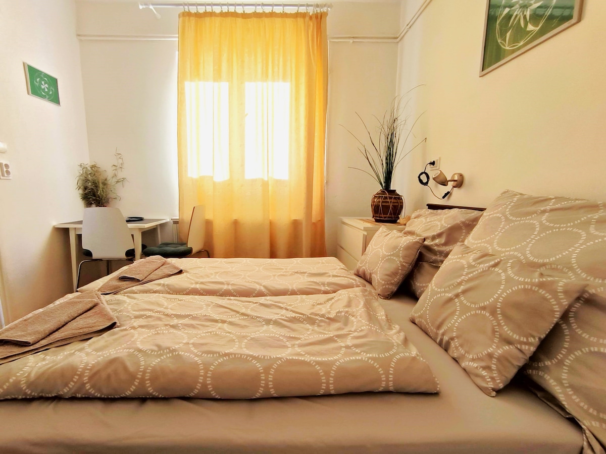 Cosy, 1-bedroom + lounge (which can be turned into a 2nd bedroom, both with a bed of 140X200 cm) apartment, with separate entrance to the main house. It is ideal for couples, a family with kids or for a group of up to 4 friends if you want a quiet environment after the noise of the city center. To arrive to the city center of Budapest takes 20-30 minutes by bus and metro or by car. In the living room there is a ceiling fan, in the bedroom there is a standing fan available.