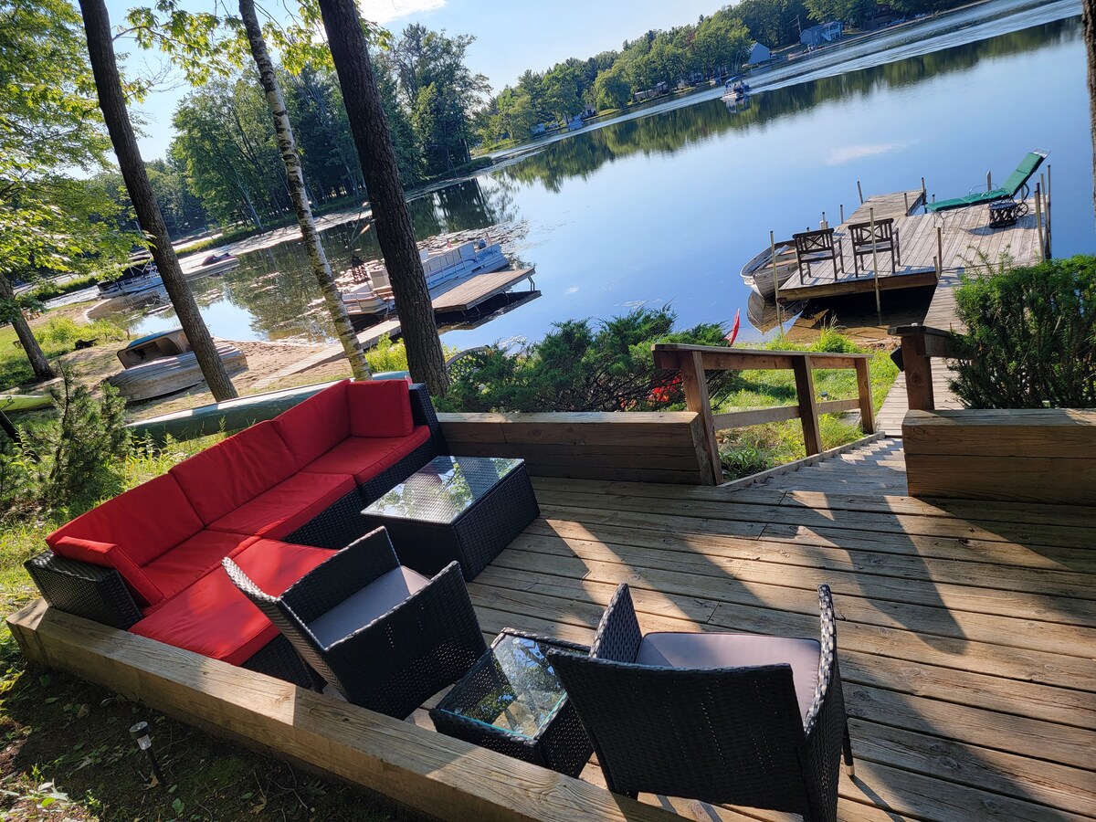 Unforgettable lakefront escape. This getaway offers a break from the fast life & the gives the comforts of home. Large accommodations to relax or have a group get together. Enjoy the flat yard perfect for outdoor games, lounging, and bonfires. Take a stroll on the two kayaks or paddle boat provided. A/C in the summer. With its unbeatable location on the waterfront and access to kayaking, fishing, golf, and ski hills you're sure to have an incredible stay!