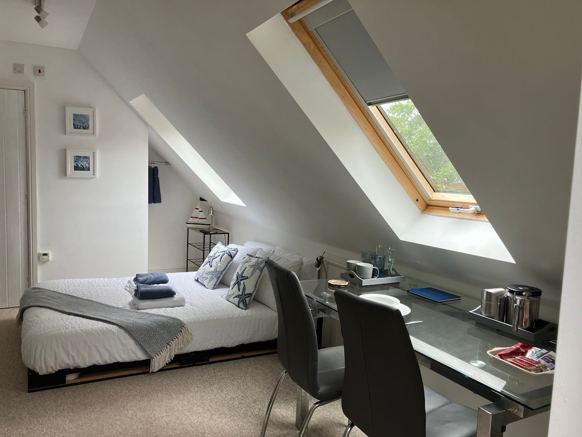 Aia stuudio on 1 magamistuba, luksuslik avatud plaan, iseseisev iseteeninduskorter meie maja 1 aakri suuruses aias Budleigh Saltertoni kesklinnas. See on kaetud pulbriga kaetud alumiiniumakende ja ustega. Vaid 2-minutilise jalutuskäigu kaugusel peatänavast, 8 minuti kaugusel rannast ja rannikust ning asub meie pika ja privaatse autosõidu tipus. Paadimaja pakub samal ajal rahu ja privaatsust, kui see asub väga mugavalt.