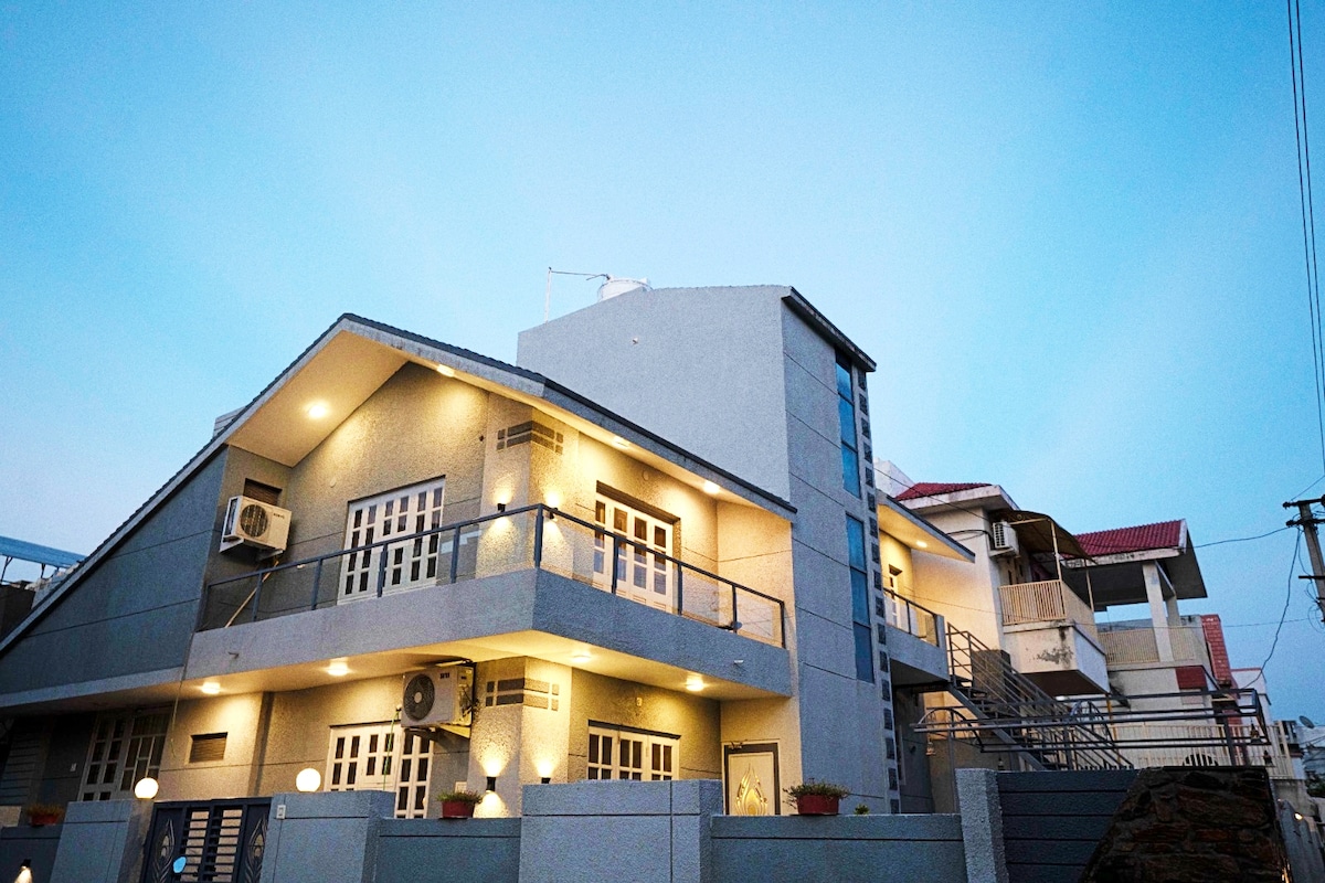Awarded Architect-Designed Garden Villa | Near Fateh Sagar Best Homestay in Udaipur! • European-inspired garden villa with rare Georgian charm • Senior-friendly layout: 2 bedrooms, living & kitchen on ground floor • Elegant designer staircase to a private first-floor bedroom • Calm, cultured, family-only environment • Lush garden with swing, perfect for chai-yoga-slow evenings • Ideal for families, weddings, seniors & long stays • Prime location • Feels like home beautiful, serene & soulful!!