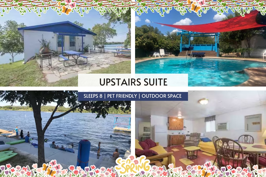 Welcome to Lakefront Suite 15 at Valentine Lakeside, part of the charming Lakefront Suites Collection — a two-story quadplex overlooking beautiful Lake LBJ. The Upper-Level Suites, like Suite 15, are conveniently located at ground level with easy access from the parking area, while the Lower-Level Suites sit just below, accessible by a short walkway that gently slopes toward the water’s edge.