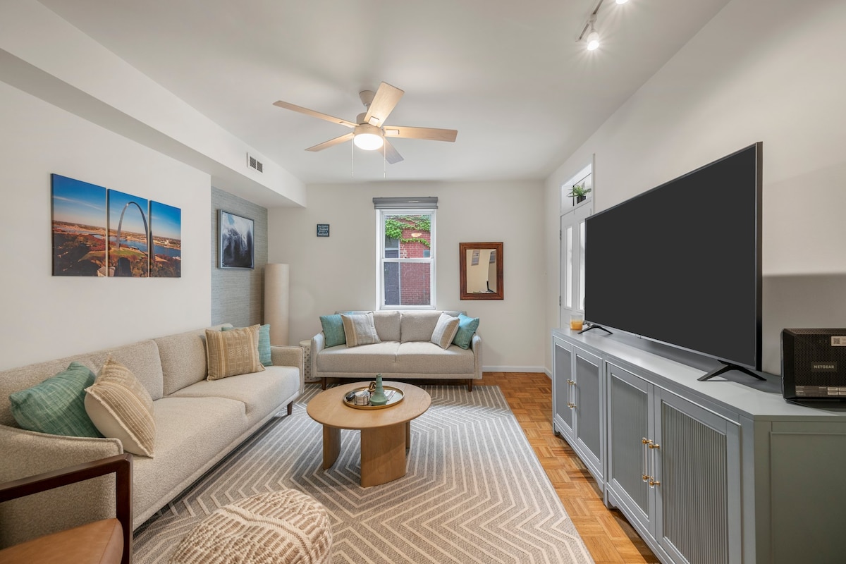 Rustic Retreat in Soulard – Walk to Bars & Farmers Market! Unwind in this cozy 1-bedroom escape in the heart of Soulard, where rustic charm meets modern comfort. Enjoy a plush Queen bed with premium linens, fiber WiFi (500 Mbps), and a fully stocked kitchen with Keurig. The spacious living area is perfect for relaxing, and the in-unit washer/dryer adds convenience. Just steps from Soulard’s vibrant nightlife, top restaurants, and the historic Farmers Market, with a Walk Score of 90. Book today!