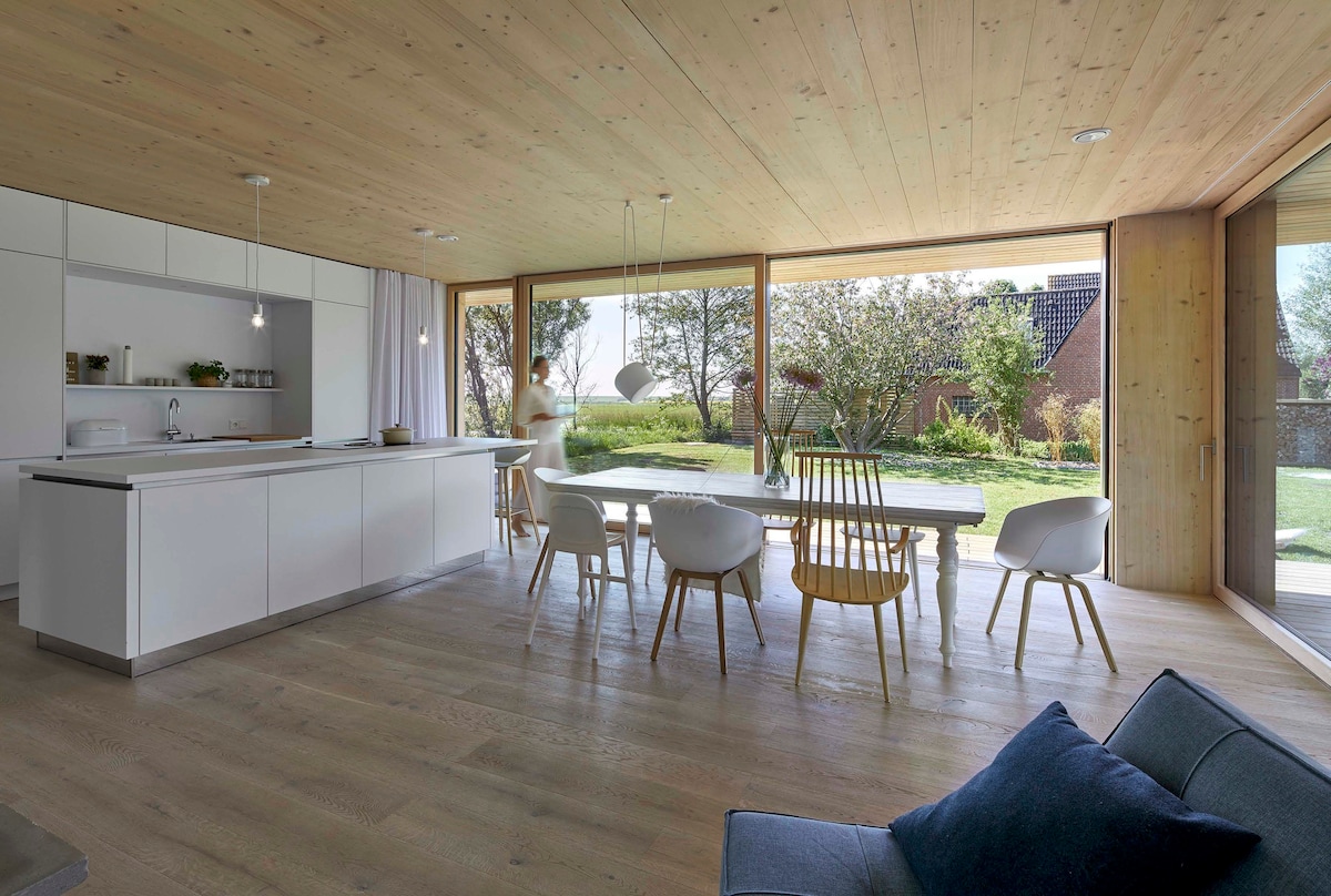 Modernne arhitektuur ja disain kohtuvad looduse ja idülliga ilusas Eiderstedtis: 140 m2 eluruumiga uues hoones, kus on 2017. aastal valmis 3 magamistuba ja 2,5 vannituba, pakuvad kerged üleujutatud toad pereliikmetele ja sõpradele, et end mugavalt tunda. Siin oleme leidnud oma ideaalse puhkepaiga Põhjamerel ja kujundanud selle nii, et saame nautida loodust, vaikust ja ruumi siin, ilma et peaksime loobuma kaasaegse elu mugavast naudingust... arhitektuurist, et end hästi tunda!