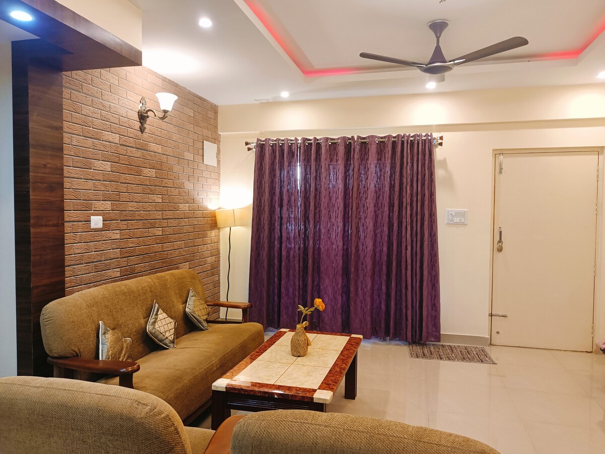 Naudi oma peatumist selles inglise-teemalises täielikult sisustatud 2 BHK korteris, mis asub laialivalguvas Prestige Groupi väravatega kogukonnas, mis on ühendatud metroojaamaga. Kasuta supermarketit, kondiitrit, kliinikut, apteeki, pesupesemisteenust, lemmikloomaparki jne. Tööta või lõõgastu rahulikus õhkkonnas. Naudi oma aurutavat jooki või päikeseloojangut, vaadates samal ajal hubaselt rõdult kaunist päikeseloojangut. Võta oma karusnahast beebid kaasa, sest me oleme lemmikloomasõbralikud.