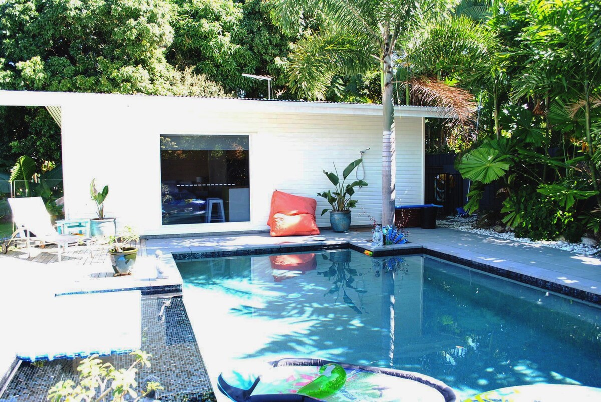 Puhka väikeses paradiisis, kus on suur bassein ukselävel ja rand lühikese jalutuskäigu kaugusel. Palm Cove 'i lähedal ja 30-minutilise autosõidu kaugusel linnast. Meie troopilises aias on rannateemalises külalistemajas kõik kodused mugavused. Avar, konditsioneeriga, köögi, basseini ja basseiniäärse mööbliga. Tasuta wifi + Netflix. Meie maja asub üle aia. Nii et leiad kohalikke nõuandeid või kõike, mida vajad. Tule ja peatu, meile meeldiks sinuga oma väikest paradiisitükki jagada!