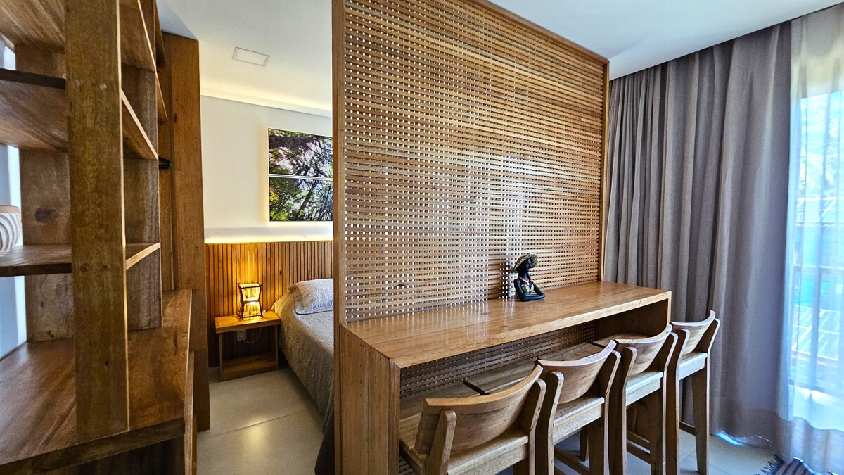 Come and rest in this beautiful and comfortable apartment with 02 suites in Ponta do Mutá, with private access to the beach, during the best sunset in Bahia. First floor, in a gated condominium, consisting of 02 suites, and a guest bathroom, kitchen, living room and incorporated balcony. Quiet and pleasant environment. We have 02 internets, 01 from a local company and 01 via Starlink satellite for backup. Accommodates 6 adults and 2 children up to 12 years old.