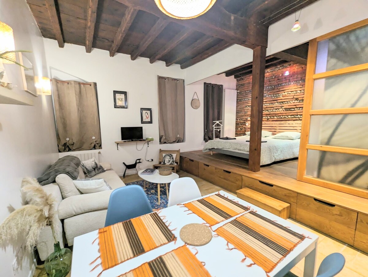 See 18 m² suur stuudio, mis mahutab ühe kuni kaks inimest, asub ideaalses asukohas, et avastada roosat linna. See asub kuulsa Saint-Pierre'i väljaku ja selle elavate baaride südames ning pakub ideaalset kohta Toulouse'i külastamiseks, ööelu nautimiseks ja piirkonna avastamiseks. Läheduses on palju poode. Palume külalistel enne broneeringutaotluse esitamist teave hoolikalt üle vaadata :-)