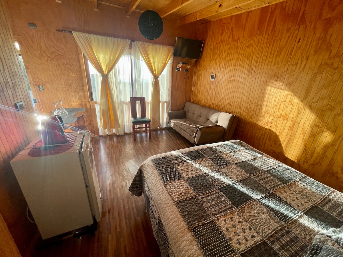 Ubicados a dos cuadras de la playa y a cinco minutos del centro de Pichilemu (caminando), Departamentos Valderrama se caracteriza por su ambiente familiar y tranquilidad. Están full equipados, con estacionamiento en el recinto, fogón para freir, disco para discada y parrilla. ¡puedes traer a tu mascota porque somos petfriendly! Este departamento, en particular, es de un ambiente con cama matrimonial y baño privado.