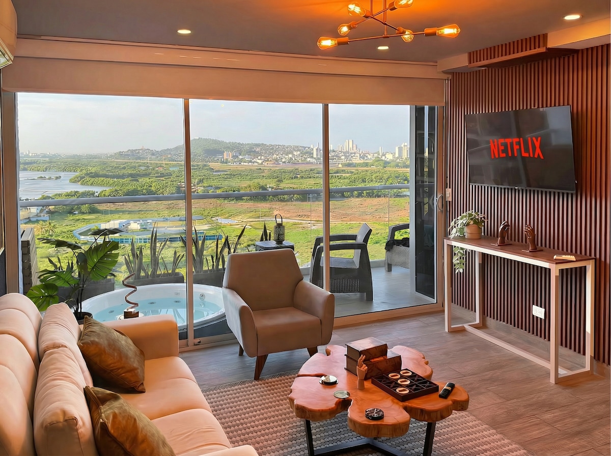 Our elegant apartment is located in one of the most complete and modern buildings in the exclusive "Cielo Mar" sector. You'll be just a few meters from "Playa Azul," one of the city's best beaches, 10 minutes from the Historic Center, and only 5 minutes from the airport. The apartment has extraordinary views of the bay and ocean, which you can enjoy from the private jacuzzi on your balcony. You can also enjoy the incredible rooftop infinity pools, complete with jacuzzi, sauna, terrace bar & BBQ
